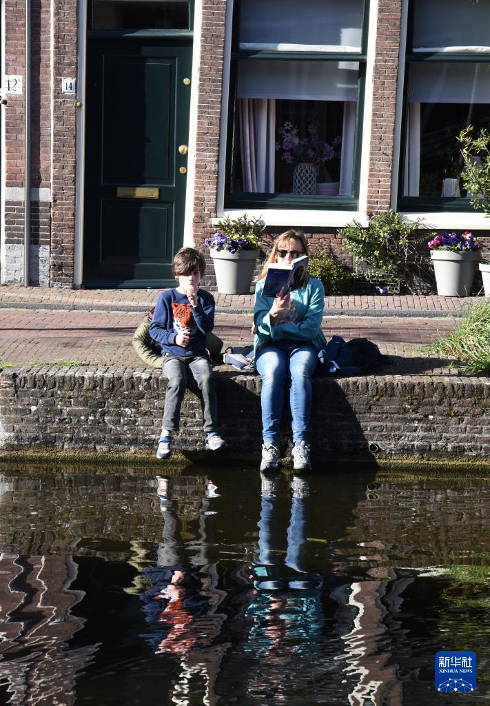 4月6日,在荷蘭萊頓,人們坐在運河邊休閑。