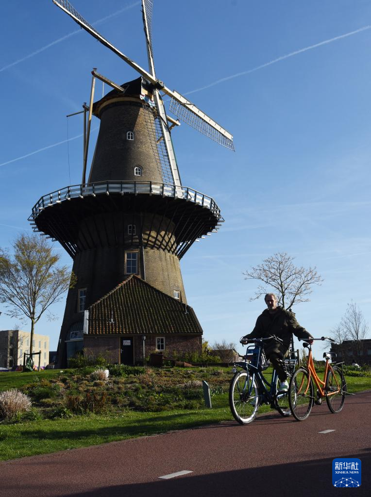 4月6日,在荷蘭萊頓,一名男子騎車從風車旁經過。